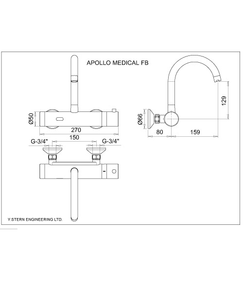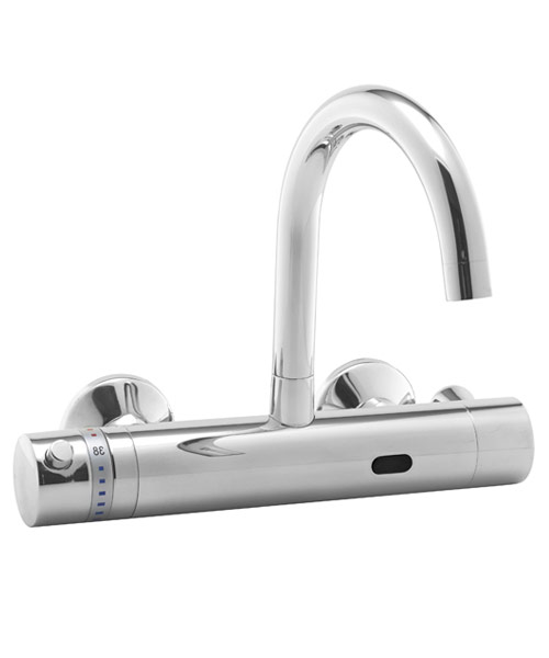 Tecnología Touch Free. Canilla electrónica para montar en pared activada por sensor infrarrojo con mezclador termostático. Batería de 9v interna montada en el cuerpo del grifo.