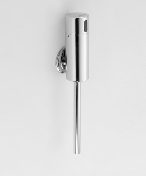 Tecnología Touch Free. Mingitorio electrónico para instalación externa construido en bronce cromado. Batería de 9v interna. Provisto de filtro antiarenillas y electroválvula incorporada. Rango del sensor ajustable manualmente o por control remoto.