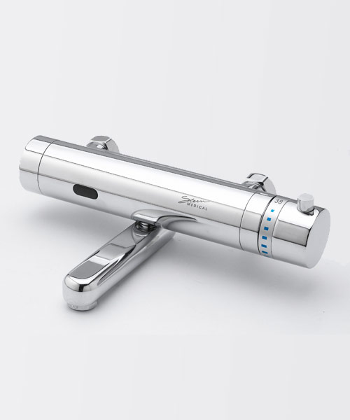 Tecnología Touch Free. Canilla electrónica para montar en pared activada por sensor infrarrojo con mezclador termostático. Batería de 9v interna montada en el cuerpo del grifo.