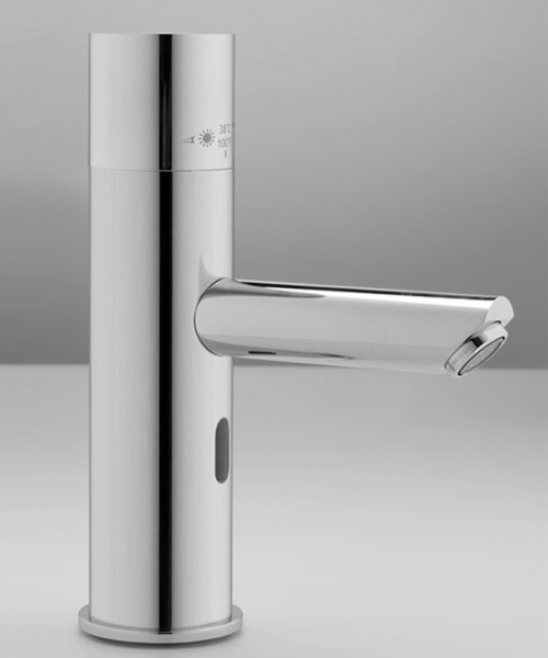 Tecnología Touch Free. Canilla electrónica para montar en pared activada por sensor infrarrojo con mezclador termostático. Batería de 9v interna montada en el cuerpo del grifo.