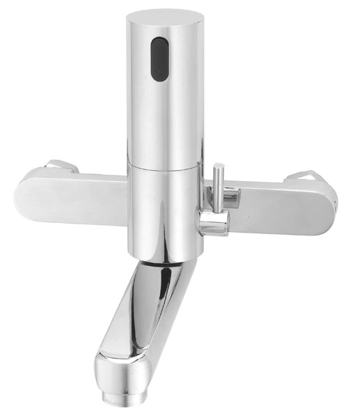 Tecnología Touch Free. Canilla electrónica para montar en pared activada por sensor infrarrojo con mezclador manual. Batería de 9v interna montada en el cuerpo del grifo.